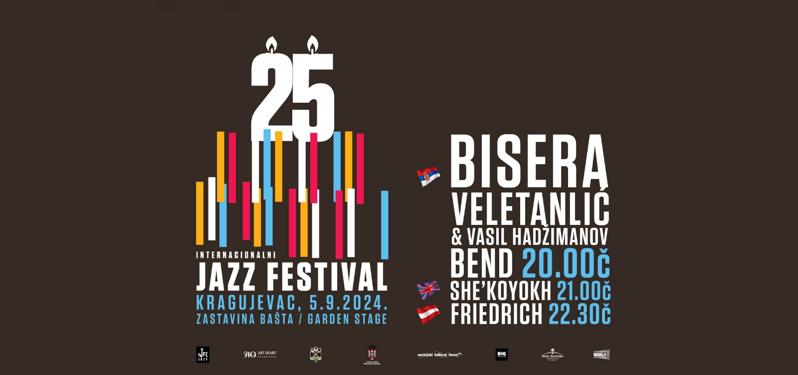 Manifestacija će se održati 5. septembra u Zastavinoj bašti, a publika će imati priliku da uživa u nastupima jazz dive Bisere Veletanlić uz pratnju Vasil Hadžimanov benda, londonskog klezmer sastava She’Koyokh, i austrijskog jazz kvarteta Friedrich.