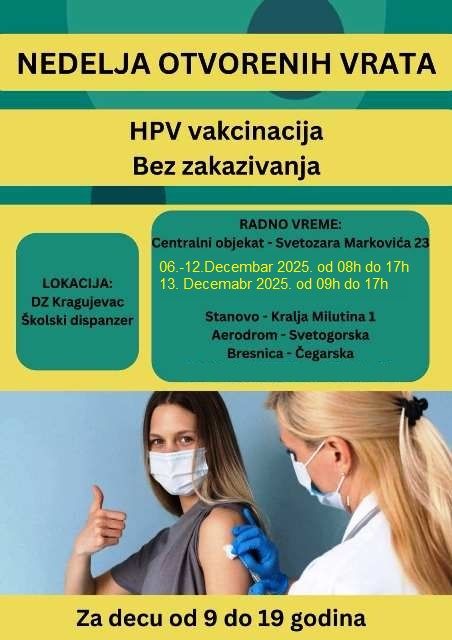 Dom zdravlja Kragujevac organizuje akciju besplatne HPV imunizacije u okviru Nedelje otvorenih vrata u periodu od 6. decembra do 13. decembra.