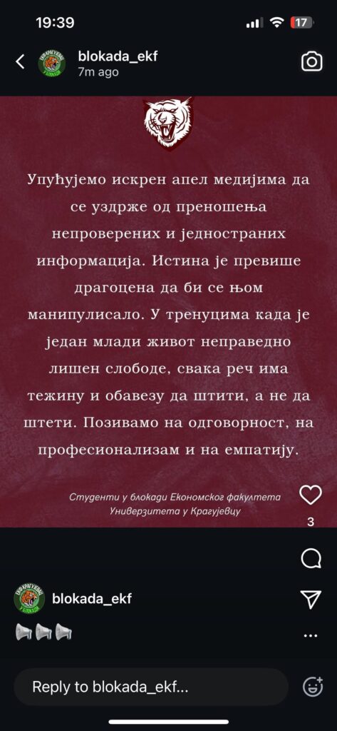 Glas Šumadije je popodne preneo vest da je Luki ukinut pritvor, na šta su reagovale njegove kolege sa Ekonomskog fakulteta, uz poruku medijima da se „uzdrže od prenošenja neproverenih i jednostranih informacija“.