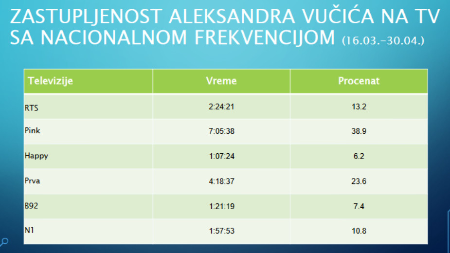 Vučić je najviše bio zastupljen na dnevnicima Pinka – sat i 58 minuta, a najmanje na RTS – 15 minuta. U centralnoj informativnoj emisiji Prve televizije Vučić je u tih 10 dana bio 24 minuta, a na televiziji B92, čiji dnevnik najkraće traje – čak 46 minuta, rekao je Perović. Vučić je najviše pozitivno prikazivan na dnevnicima svih televizija osim N1, gde je bio u neutralnom ili negativnom kontekstu.