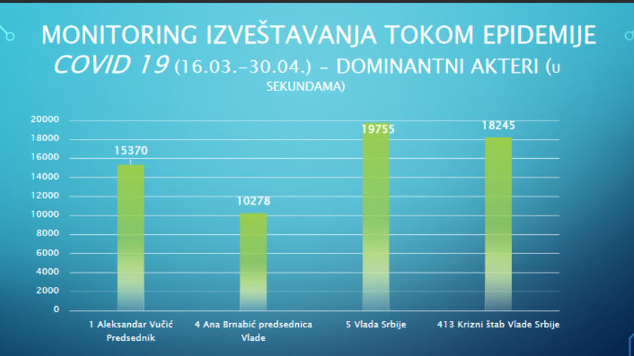 U izveštavanjima posmatranih televizija je, gledajući po vremenu zastupljenosti, na prvom mestu Vlada Srbije i aktivnosti ministara, sa 20.000 sekundi, na drugom Krizni štab za borbu protiv korona virusa, na trećem predsednik, a na četvrtom premijerka.