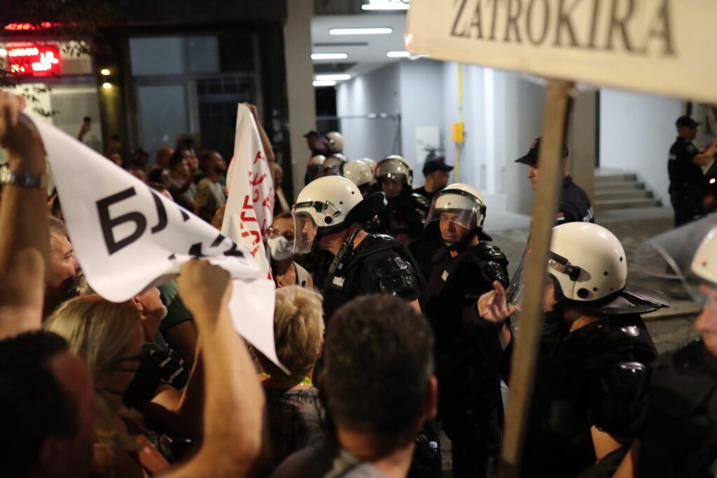 Građani uzvikuju policiji „spustite štitove“.