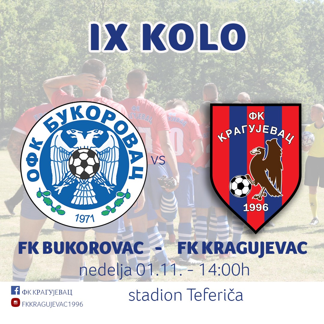 Sutra, u nedelju, 1. novembra igra se Deveto kolo Treće gradske fudbalske lige. FK „Kragujevac” gostuje FK „Bukorovcu” koji je za ovu priliku domaćin na stadionu na Teferiču. Utakmica počinje u 14 sati. Kragujevčani su trenutno treći na tabeli sa 13 bodova a Bukorovčani peti sa šest manje. Prilom prošlog susreta ova dva kluba trijumfovao je „Kragujevac” sa 2 : 0 na svojoj „Jazbini” u Košutnjaku.