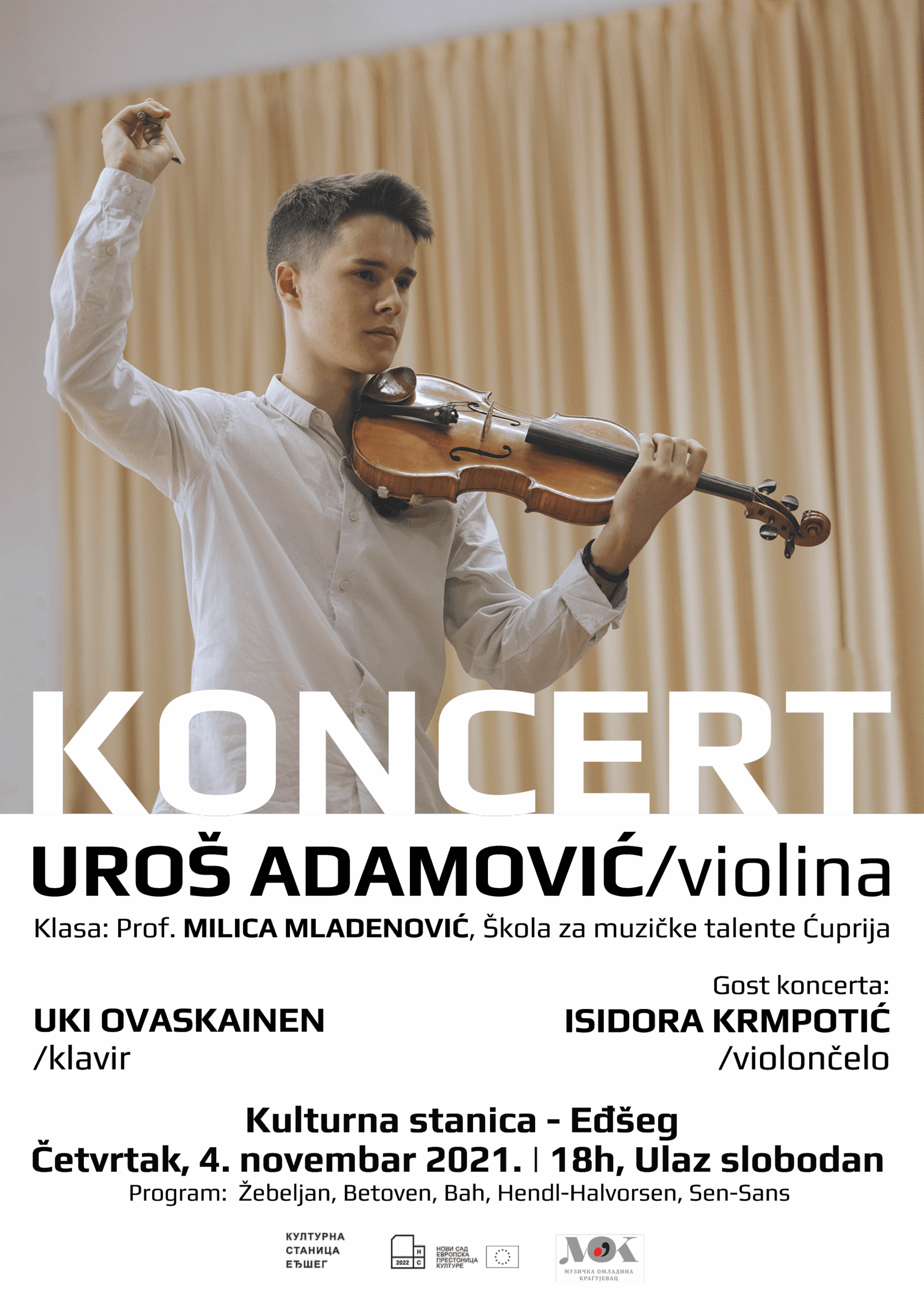 Publika koja te večeri poseti kulturnu stanicu Eđšeg imaće priliku da čuje jednog od najtalentovanijih violinista svoje generacije, koji će izvesti dela naše najprominentnije i na svetskoj muzičkoj sceni najizvođenije kompozitorke Isidore Žebeljan, dela iz perioda baroka i klasicizma, kao i jedno od najzahtevnijih i najvirtuoznijih dela violinske literature Introdukciju i Rondo capriccioso, francuskog kompozitora Kamija Sen-Sansa.
