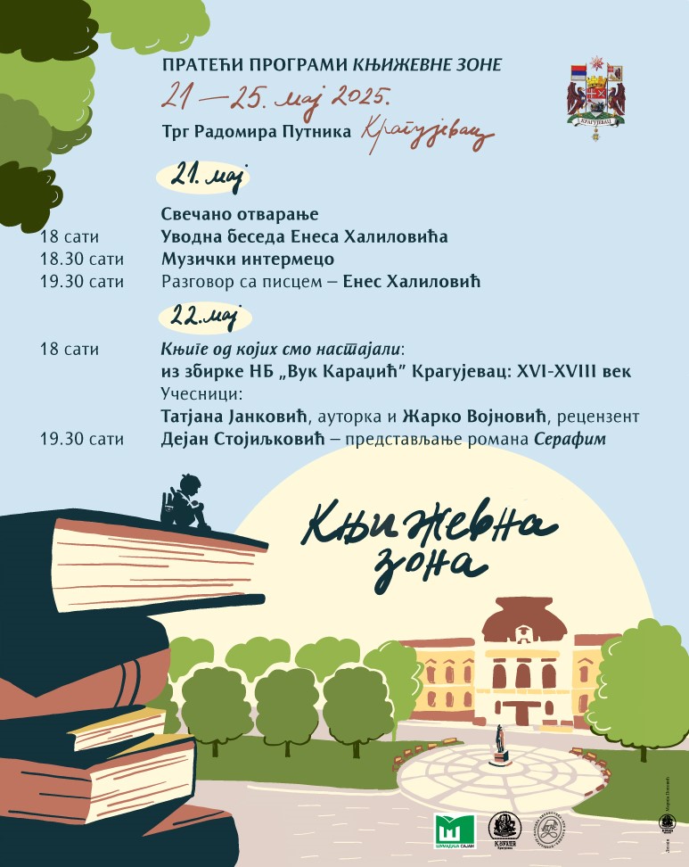 Manifestacija „Književna zona“ u organizaciji Šumadija sajma, Ustanove kulture „Koraci“ i Narodne biblioteke „Vuk Karadžić“ održaće se na Trgu Radomira Putnika od 21. do 25. maja. Svečano otvaranje Književne zone biće održano danas, 21. maja, sa početkom od 18 časova.