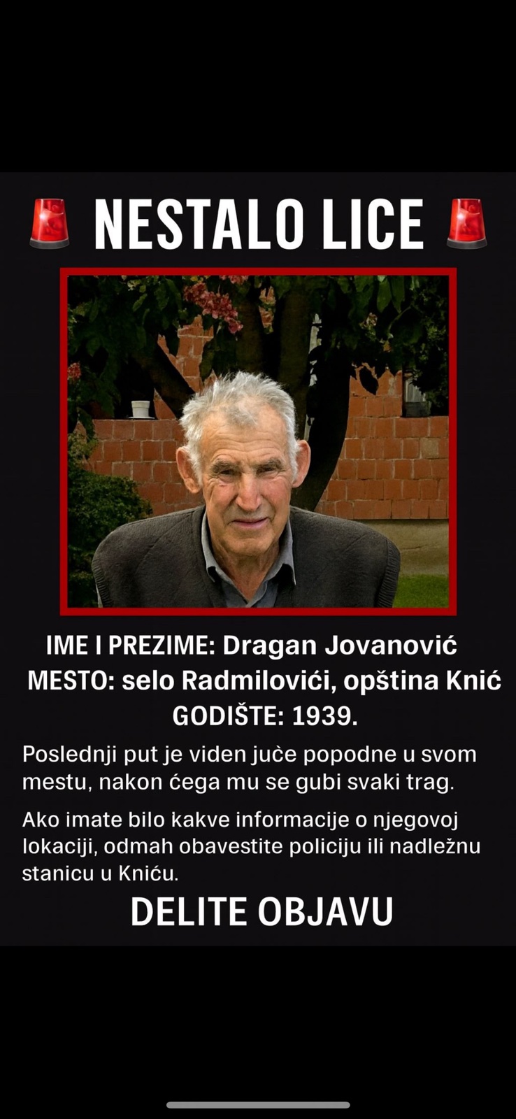 Nestao čovek iz sela Radmilović Društvo Grad 30/09/202530/09/2025 286Ostavi komentar na Nestao čovek iz sela RadmilovićNestao je Dragan Jovanović iz sela Radmilović, opština Knić. Poslednji put je viđen juče popodne u svom mestu. Jovanovic je na sebi imao sivo-teget košulju i prsluk.Ako imate bilo kakvu informaciju, javite na broj telefona: 0637462260