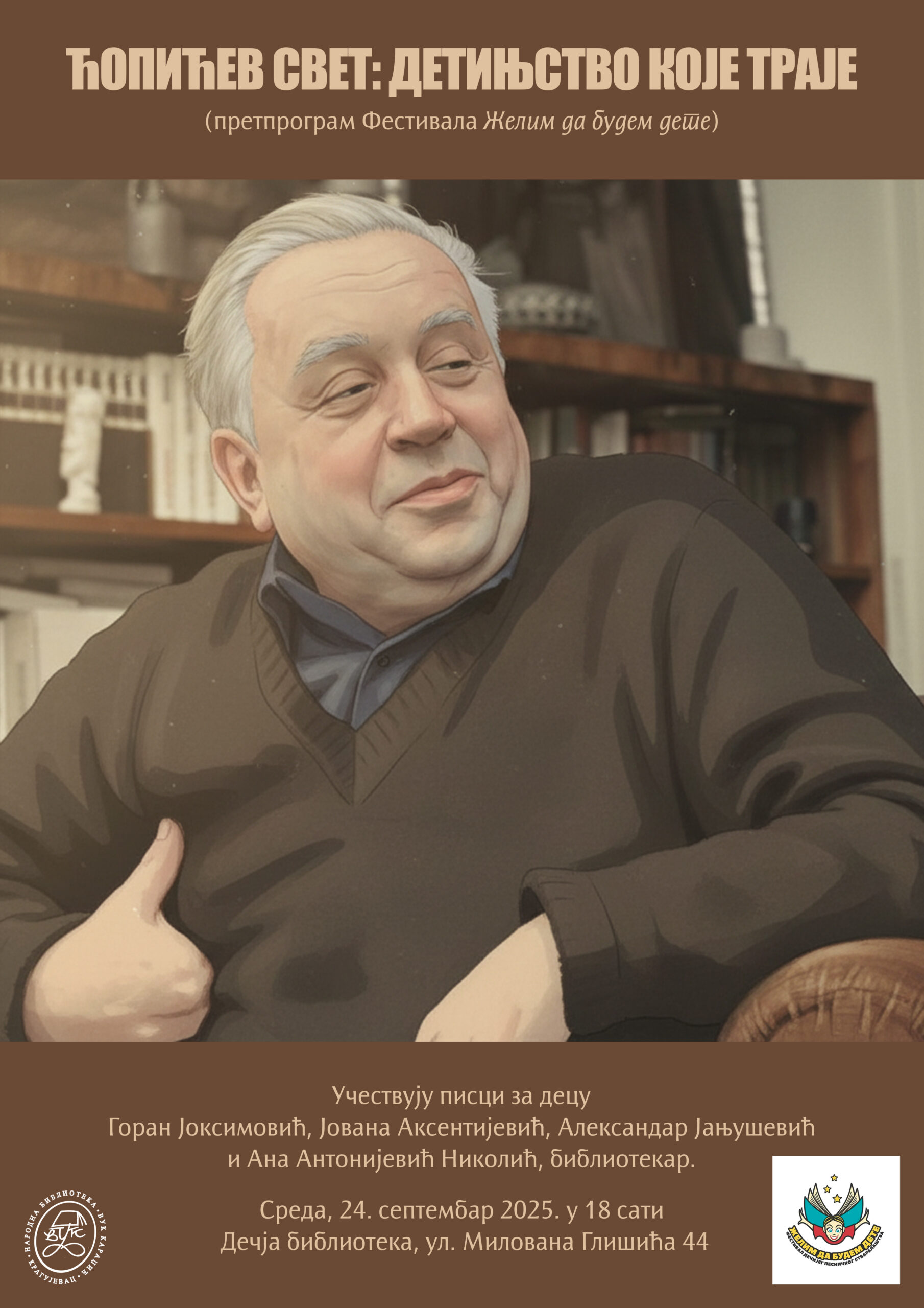 U okviru Festivala „Želim da budem dete“, u sredu, 24. septembra 2025. godine, sa početkom u 18 časova, u Dečjoj biblioteci u ulici Milovana Glišića 44 biće održan tradicionalni okrugli sto posvećen delima velikih pisaca za decu.