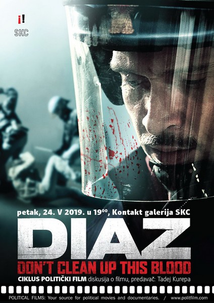 U Kontakt galeriji SKC-a, sutra, u petak, 24. maja, u 19 časova, biće prikazan film film „Dijaz: Ne čisti tu krv“. To je je francusko-italijansko-rumunska drama u režiji Danijela Vikarija koja prati poslednje dane samita G-8 u Đenovi 2001. godine, tokom kojeg su održane velike demonstracije koje su rezultirale velikim policijskim nasiljem i smrću jednog demonstranta.