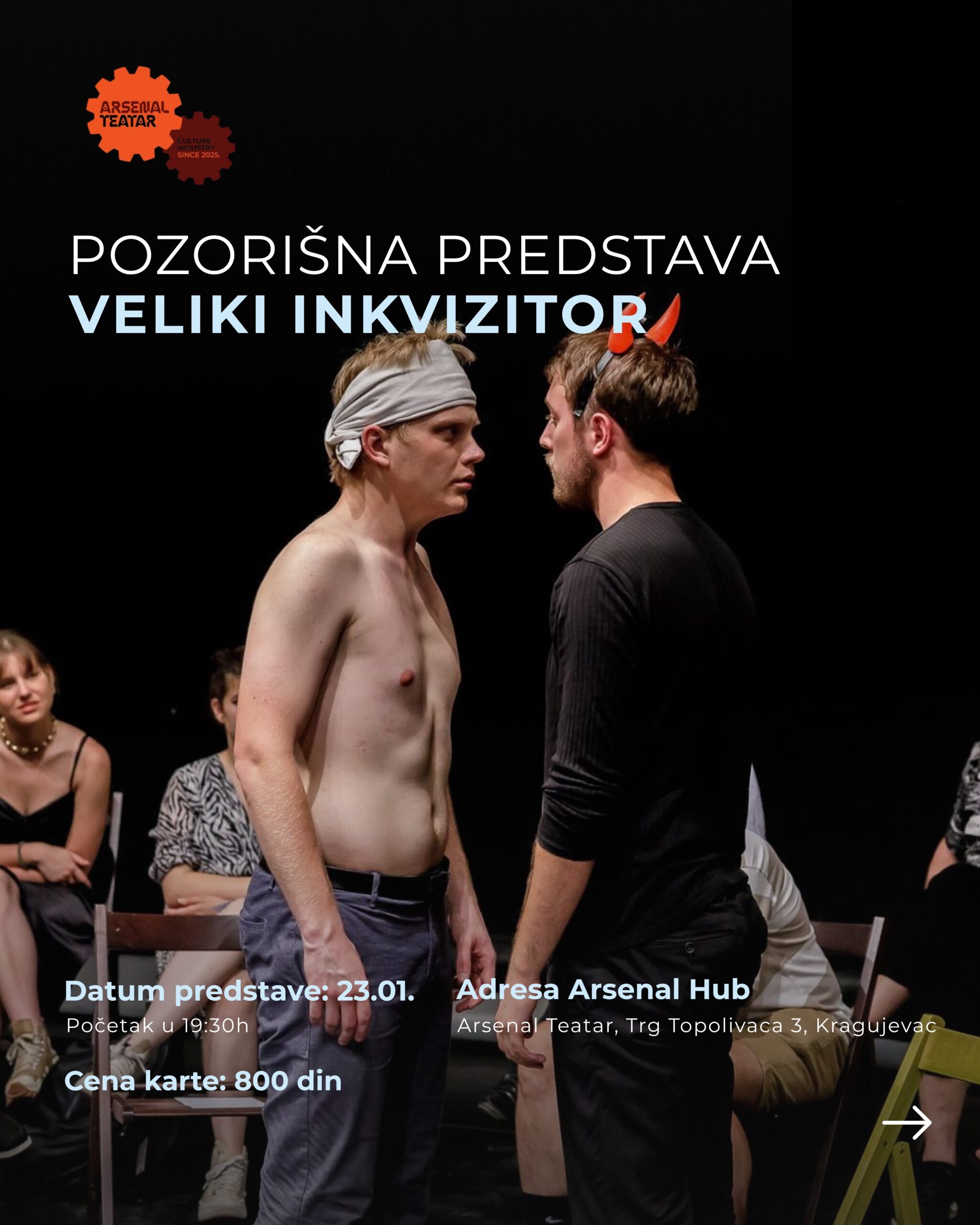 Predstava „Veliki inkvizitor“ biće izvedena 23. januara, sa početkom u 19:30 časova, u prostoru Arsenal Teatra, Trg Topolivaca 3, Kragujevac. Cena karte iznosi 800 dinara.