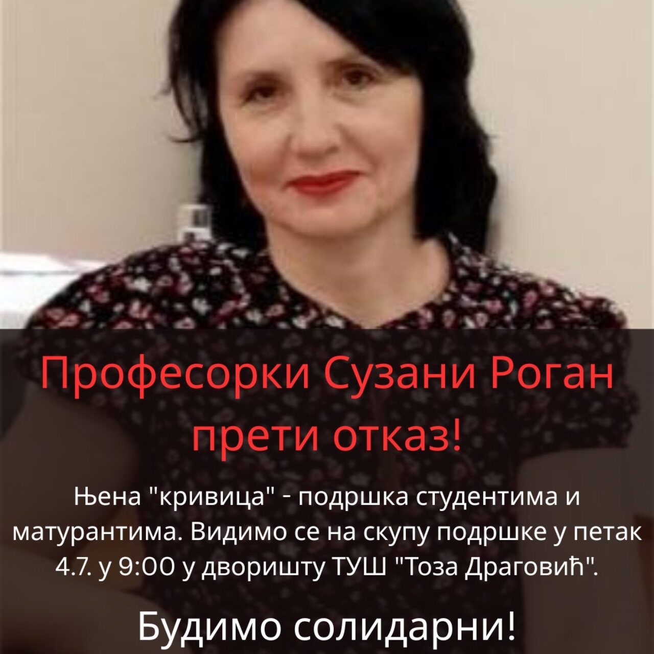Shodno svemu navedenom, Suzani Rogan preti otkaz, pa joj podrška u ovom trenutku mnogo znači. Skup podrške profesorki srpskog jezika i književnosti zakazan je u petak od 9 časova ispred srednje škole Toza Dragović.