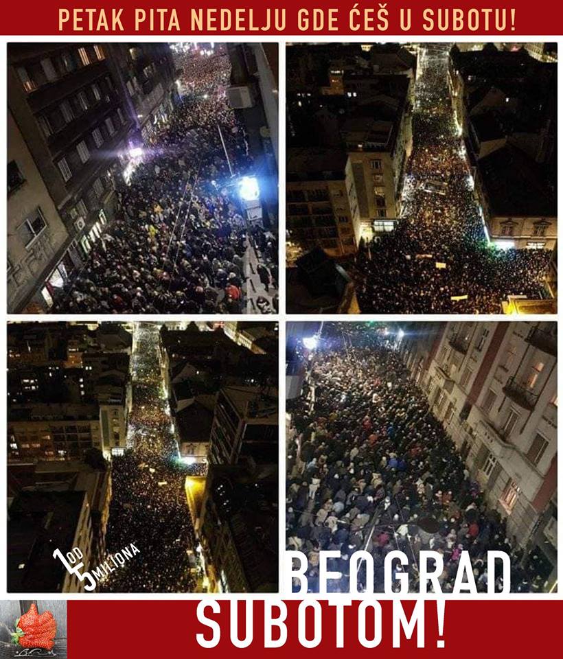 Pročitaj višePeti dan protesta u Beogradu (subota, 5. januar), pod sloganom „Jedan od pet miliona“, okupio je nekoliko desetina hiljada građana. Nošene su srpske zastave, transparenti „Počelo je“, „Ti brojiš, mi odbrojavamo“, čule su se pištaljke i trube. Nakon okupljanja na studentskom platou, usledila je šetnja centralnim ulicama, uz zadržavanje kod zgrade RTS-a, gde je zatražena […]