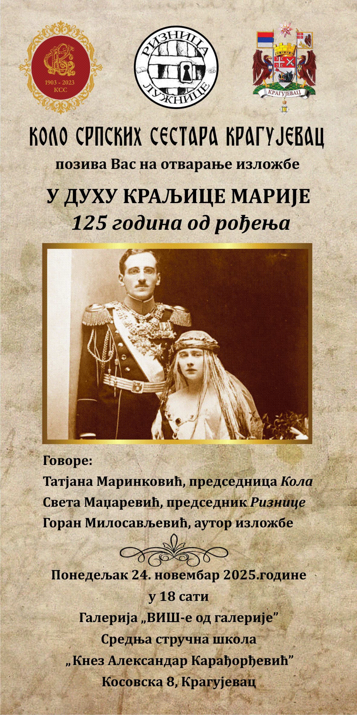 Кolo srpskih sestara ima čast da Vas obavesti da će izložba „U duhu Кraljice Marije – 125 godina od rođenja“ biti svečano otvorena u ponedeljak, 24. novembra 2025. u 18 sati u Srednjoj stručnoj školi „Кnez Aleksandar Кarađorđević“ u Кragujevcu. Ova izložba je realizvana uz podršku Grada Кragujevca i posvećena je izuzetnoj ličnosti Кraljice Marije […]