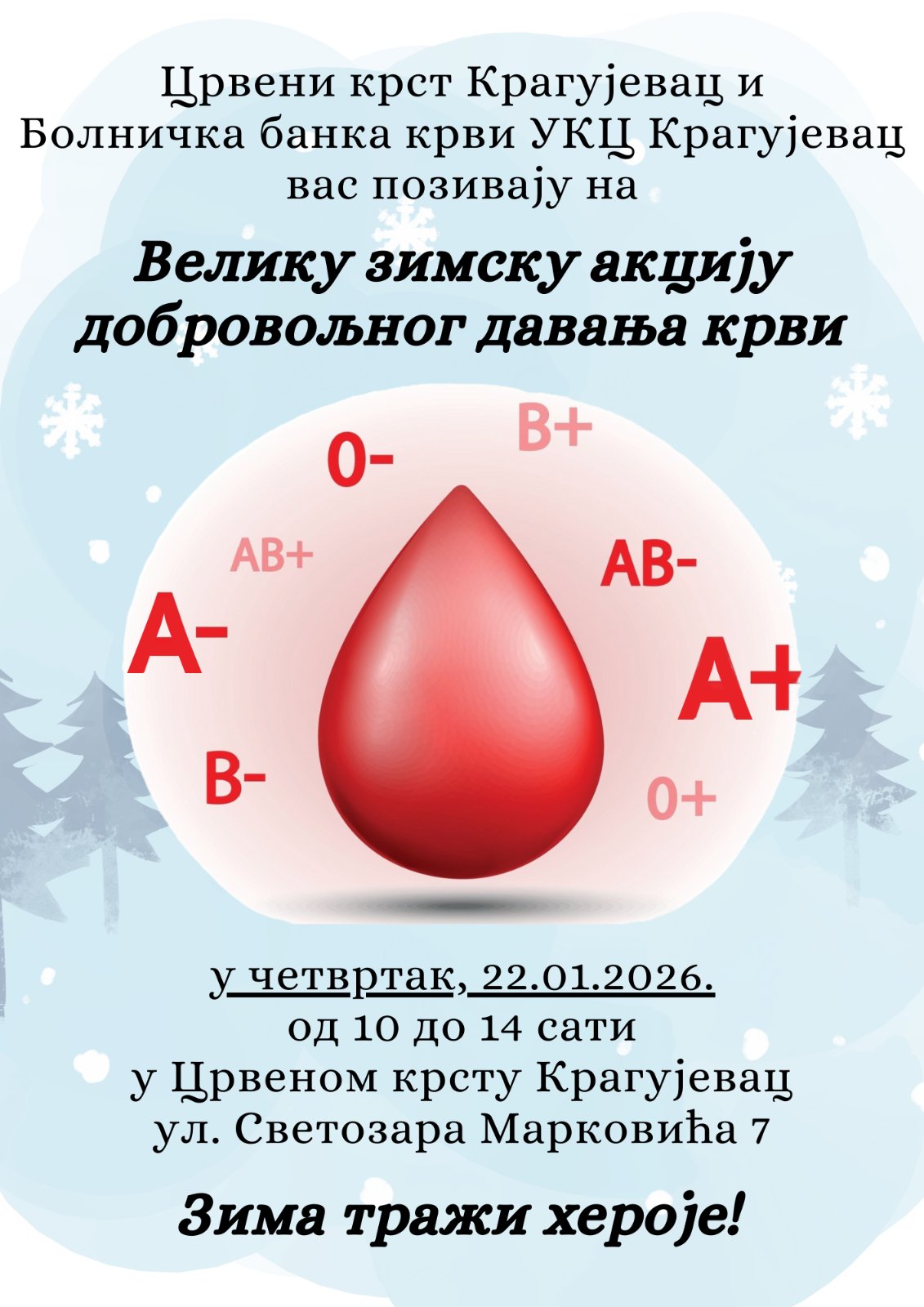 U periodu od 3. januara do 28. februara 2026. godine, Institut za transfuziju krvi Srbije, u saradnji sa Crvenim krstom Srbije i lokalnim samoupravama, realizuje tradicionalnu 18. Zimsku kampanju dobrovoljnog davanja krvi, pod sloganom „Zima traži heroje“ . Cilj Zimske kampanje je da se obezbede dovoljne količine krvi za lečenje bolesnih i povređenih pacijenata u […]