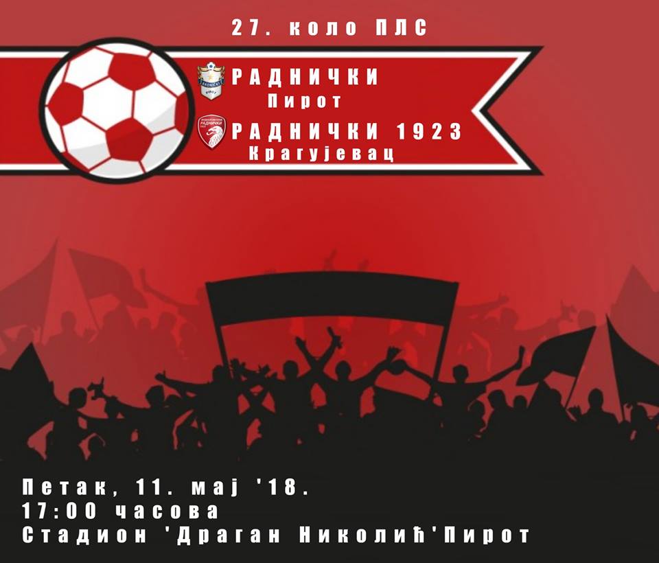 U 27. kolu Prve lige Srbije fudbaleri Radničkog 1923 gostuju u Pirotu. U petak (11. maj) u 17 sati, na stadionu „Dragan Nikolić“ u Pirotu sastaju se Radnički 1923 i Radnički Pirot. U 26. kolu fudbaleri Radničkog pobedili su, na svom terenu, tim Temnića rezultatom 4:2.