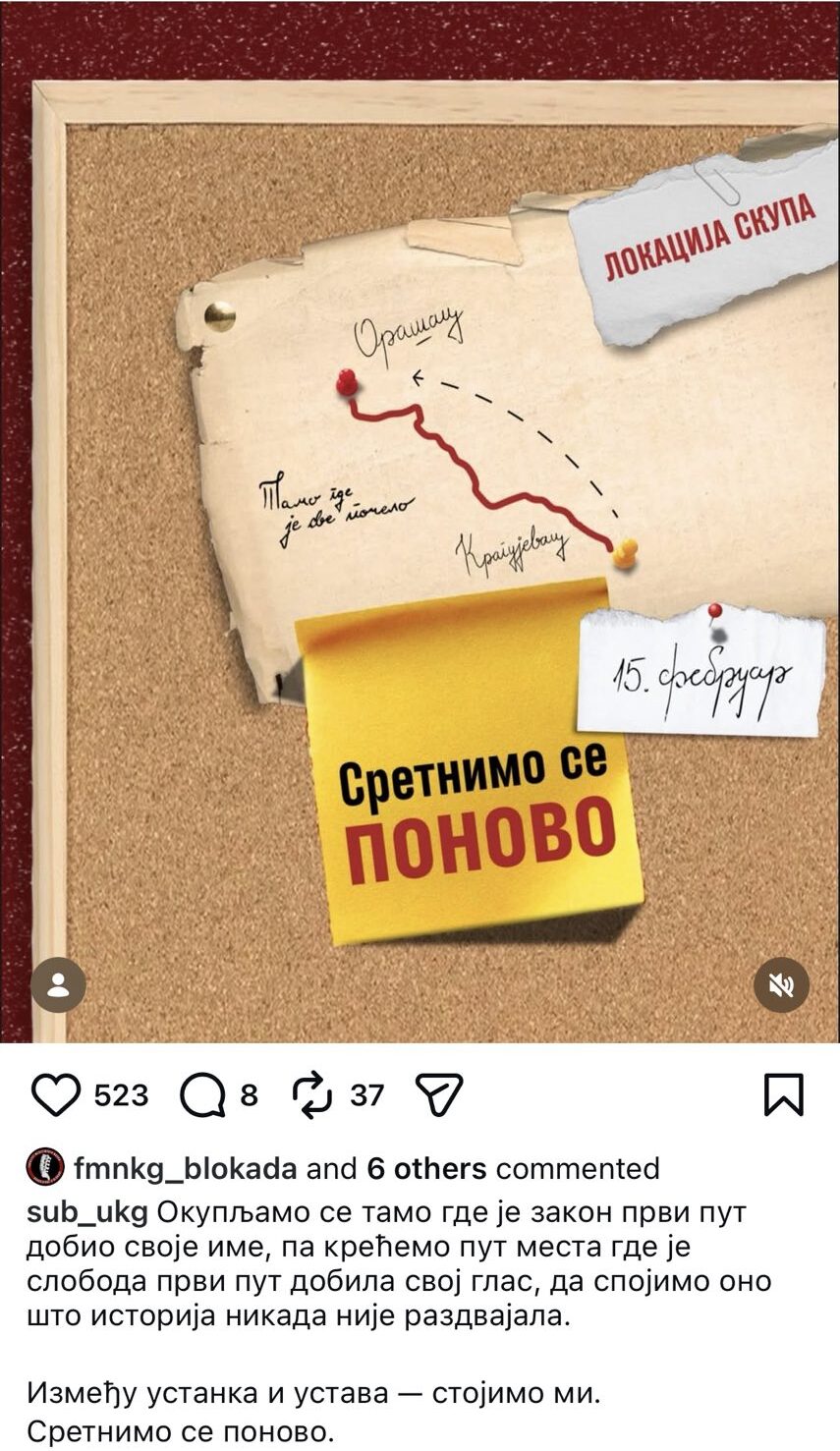 Studenti iz Kragujevca pozvali su na veliki skup na Sretenje 15. februara koji će početi u prepodnevnim satima u Kragujevcu. Planirano je najpre okupljanje u Kragujevcu kod Stare skupštine, gde je donet prvi Ustav moderne Srbije, tačnije kod kamenog pešačkog mosta, u Lepeničkom bulevaru, a nakon toga će se, kako je za sada planirano, od […]