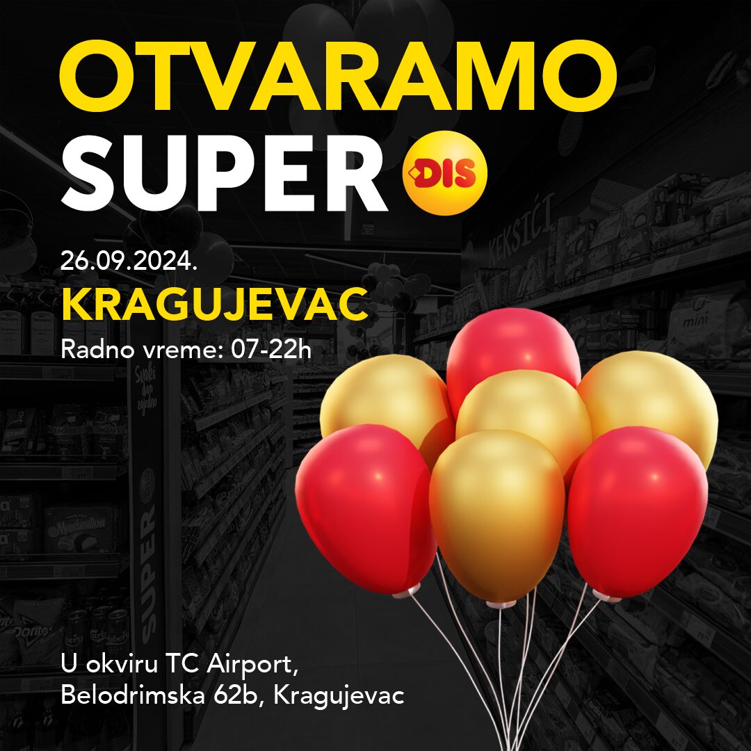 Kompanija DIS će 26. septembra otvoriti još jedan market u Kragujevcu! SUPER DIS market, u okviru novootvorenog TC Airport u naselju Denino Brdo, predstavlja sasvim novo i pozitivno iskustvo kupovine za sve Kragujevčane. U moderno opremljenom, prijatnom i funkcionalnom ambijentu od 850m2 potrošači će imati priliku da otkriju i iskuse asortiman od preko 5.000 artikala […]