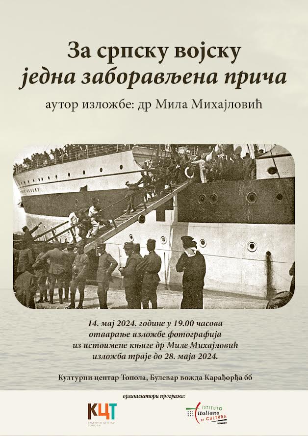 U utorak 14. maja u 19 časova održaće se otvaranje izložbe fotografija iz istoimene knjige dr Mile Mihajlović „Za srpsku vojsku – jedna zaboravljena pričaˮ u holu Kulturnog centra Topola, prenosi TopPres.