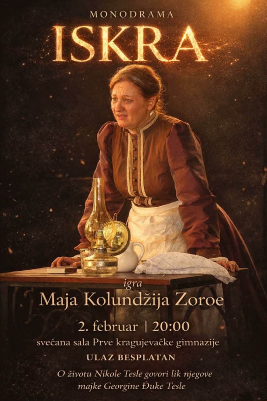 U ponedeljak, 2. februara, u Svečanoj sali Prve kragujevačke gimnazije održaće se priča o Nikoli Tesli rečju njegove majke Đuke, a u izvođenju glumice Maje Kolundžije Zoro. Ulaz na svečanost je besplatan, dok je početak označen za 20 časova.