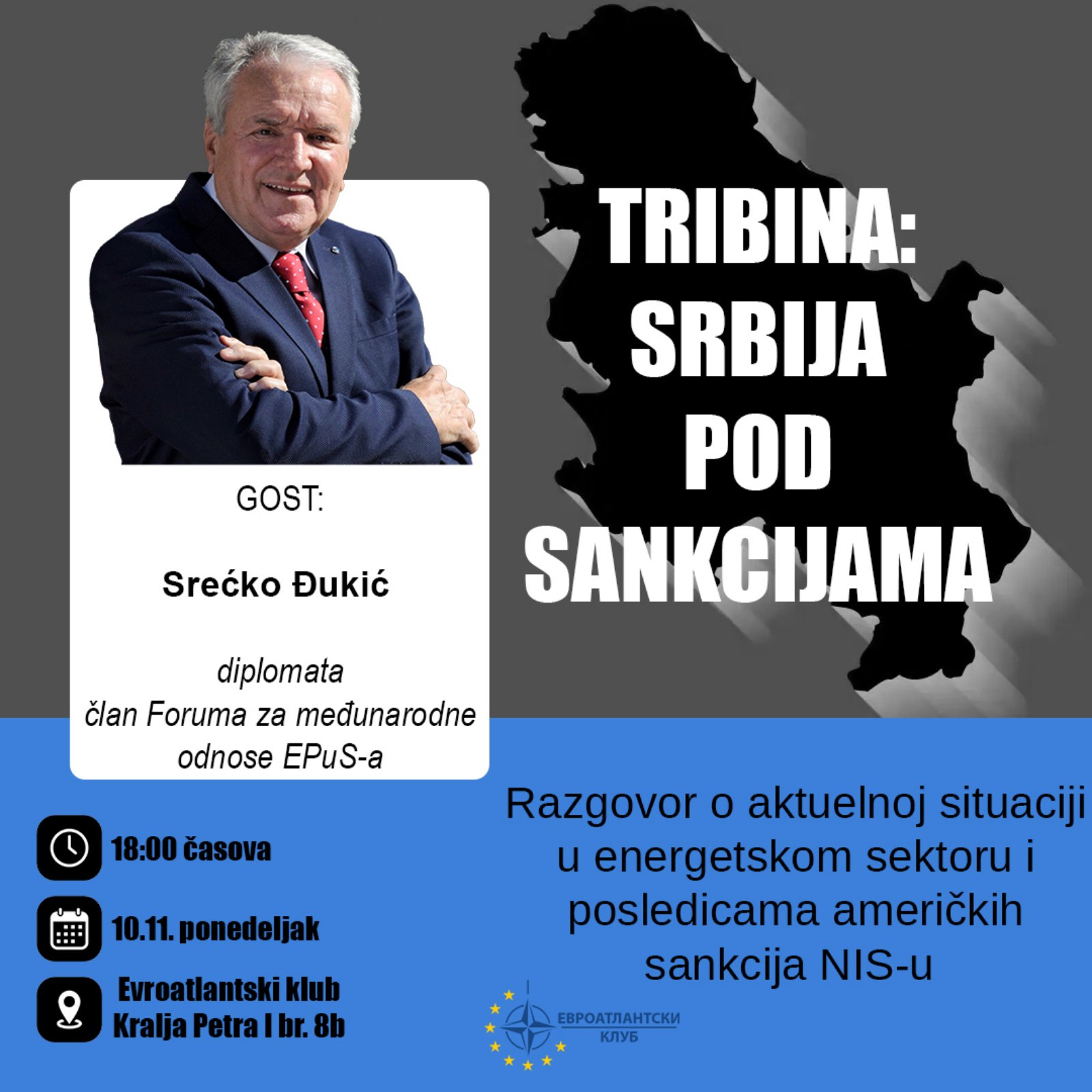 Evroantlatski klub u Kragujevcu organizuje tribinu „SRBIJA PRED SANKCIJAMA“ povodom aktuelne situacije u energetskom sektoru i američkih sankcija NIS-u.