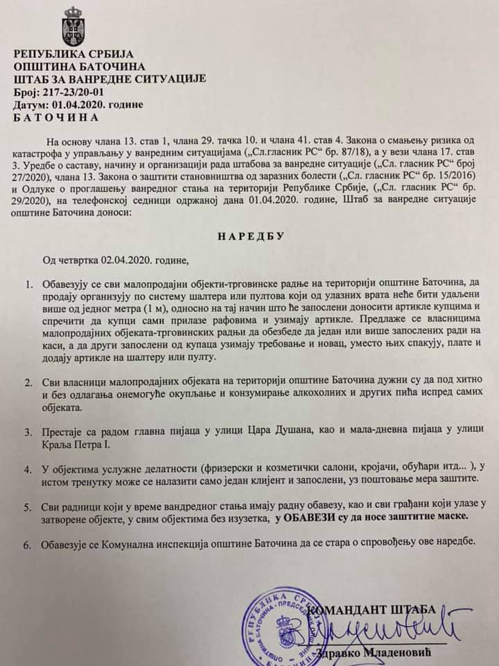 Gradski štab za vanredne situacije opštine Bor doneo je pre dva dana „naredbu“, kojom se „naređuje svim udruženjima građana kao i dobrovoljnim društvima da stave na raspolaganje sve raspoložive ljudske resurse za pomoć najstarijim građanima u vidu donošenja namirnica i lekova na kućnu adresu i organizovanje lekarske pomoći“.